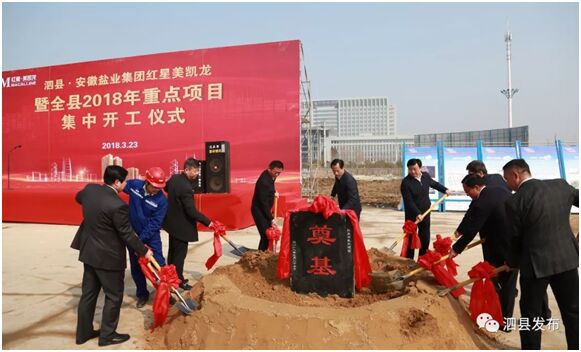 3月23日上午,泗縣縣委縣政府在徽鹽·虹都府項(xiàng)目紅星美凱龍地塊隆重舉行泗縣·安徽鹽業(yè)集團(tuán)紅星美凱龍暨全縣2018年重點(diǎn)項(xiàng)目集中儀式??h領(lǐng)導(dǎo)張志強(qiáng)、王法立、趙朝法、龐壯、趙明等四大班子成員、安徽鹽業(yè)集團(tuán)徽鹽地產(chǎn)領(lǐng)導(dǎo)程群、泗縣項(xiàng)目全體人員及縣直有關(guān)單位、40個(gè)集中開(kāi)工項(xiàng)目負(fù)責(zé)人等出席了奠基儀式。