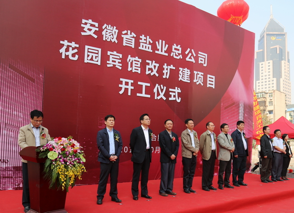2014年10月18日上午,安徽省花園賓館改擴建項目在花園賓館舉行隆重的開工奠基儀式,參加儀式的嘉賓有:中共廬陽區(qū)委書記吳勁、副書記張家祥,廬陽區(qū)副區(qū)長李仲生、中建八局四公司董事長周可璋及相關(guān)協(xié)作單位、省鹽業(yè)總公司總經(jīng)理詹先豪,副總經(jīng)理王良貴、顏宗華、楊曉彬,省公司本部機關(guān)處室及直屬公司主要負責人。